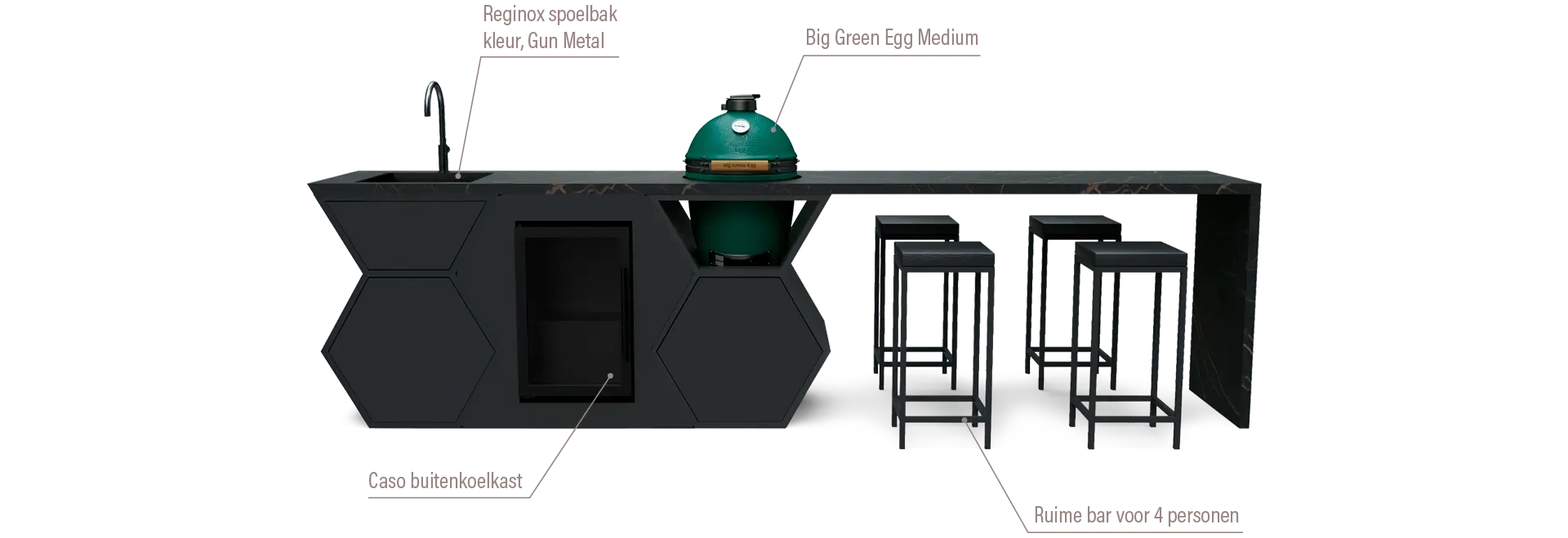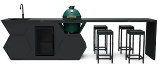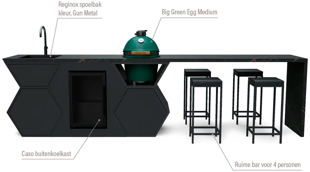 Nooit meer je gasten uit het oog verliezen en hen laten genieten van een ultieme kookervaring. Deze luxe buitenkeuken biedt alles wat je nodig hebt. Uitgerust met een 6-persoons bar, een Big Green Egg Large, een Qooking tafel, vier praktische lades, en een Reginox spoelbak en kraan. Zoals de naam al zegt, deze buitenkeuken heeft het allemaal.