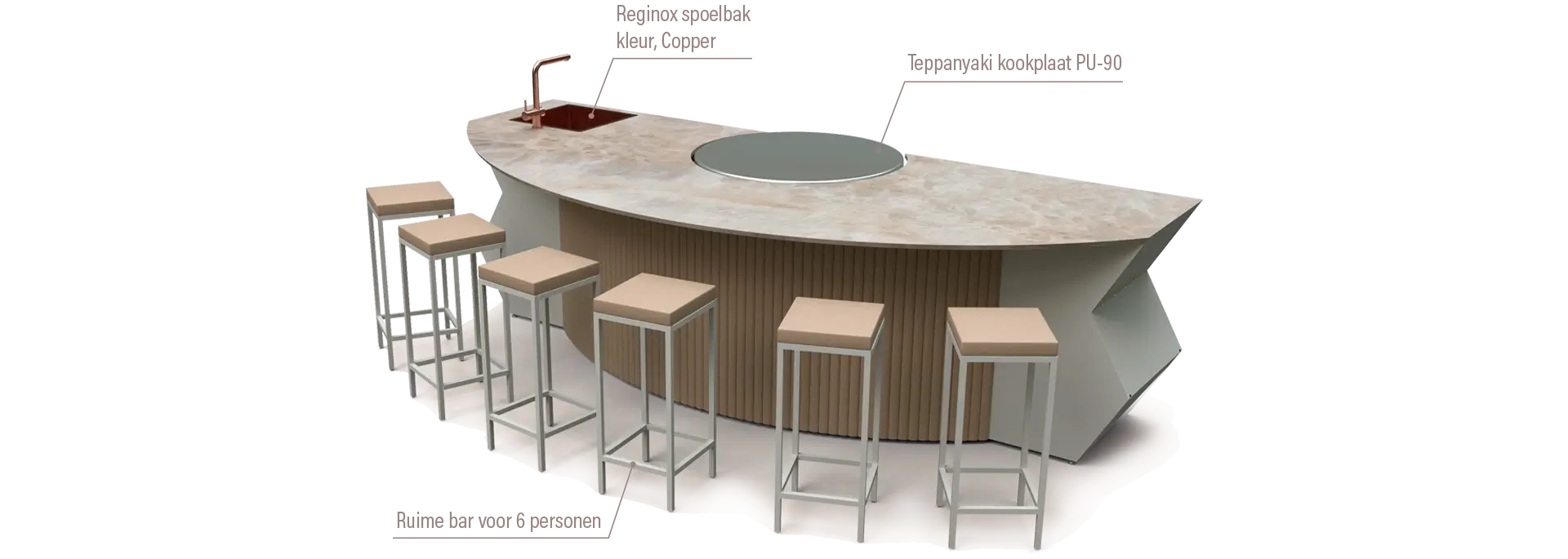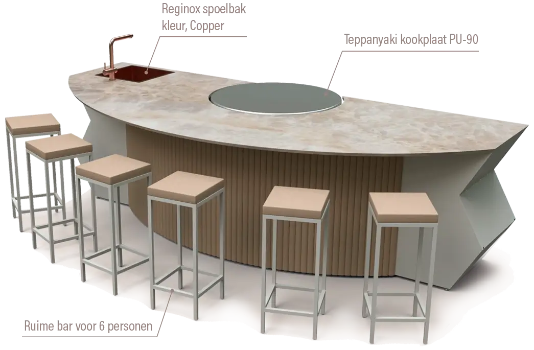 Ontdek de perfecte combinatie van design, beleving en functionaliteit. Dit unieke ontwerp is voorzien van een indrukwekkende ronde teppanyaki kookplaat (Ø 90 cm), strategisch centraal geplaatst voor de ultieme live cooking ervaring. De chef staat aan de ene kant van de plaat, terwijl zes gasten comfortabel plaatsnemen aan de bar, met direct zicht op de bereiding van de gerechten. Dit zorgt voor een intieme, interactieve en culinaire belevenis zoals je die alleen in de beste restaurants ervaart – maar dan gewoon in je eigen tuin!